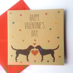 This is a listing for a valentine card. It has two black labradors with red and blue glittered collars on the front and says "Happy Valentine's Day". It is approx 125mm x 125mm in size, is printed on brown kraft card and comes with a red envelope and cello bag. It is blank inside for your own message.