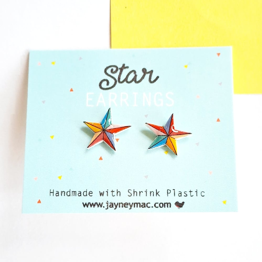 A pair of handmade shrink plastic star earrings sealed with a resin glaze, with stainless steel earring posts.