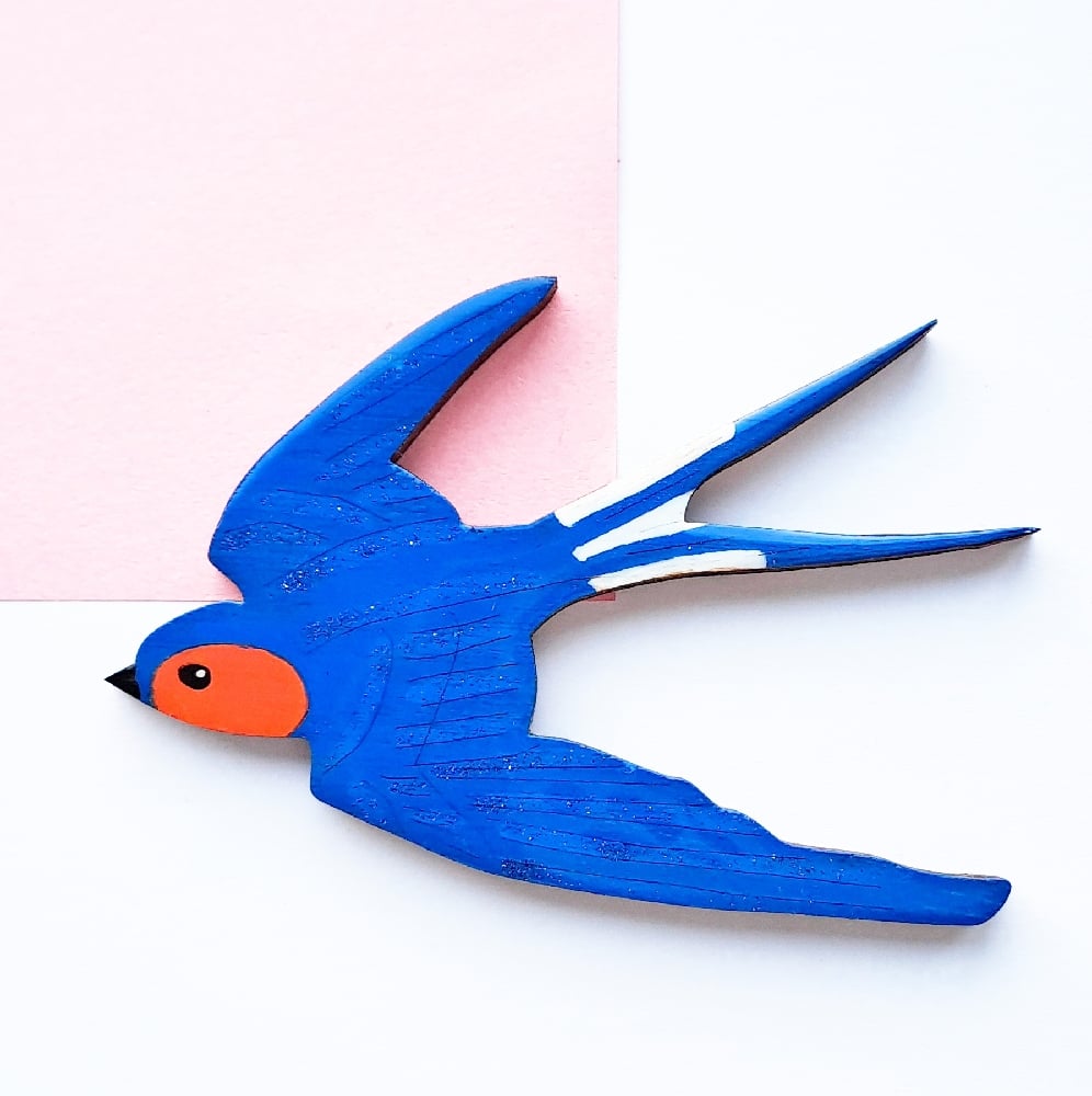 This swallow brooch is made with lasercut birch ply, which is hand painted with added with blue glitter on the feathers. It is coated with a clear resin glaze. It is secured with a silver plated metal brooch pin at the back. It is approx 80mm x 55mm in size. It would make a perfect gift for any bird lover.
